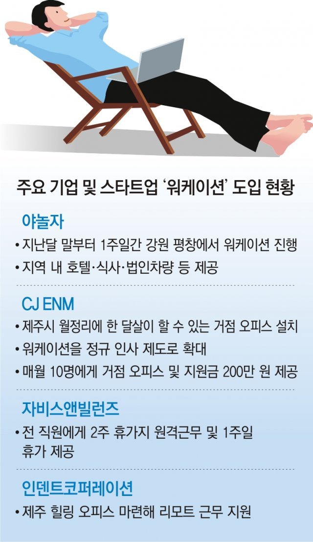 (일을 하면서 여행지를 돌아다니며 아이디어를 생각하는)하루종일 컴퓨터만 보다가 다른 풍경 속에서 일을 해보니 아이디어가 더 잘 떠오른다고나 할까요. 업무 스트레스가 확 해소되는 느낌이 있어요. 스타트업 자비스앤빌런즈에서 마케터로 일하고 있는 조씨는 올해 6월 8박9일의 기차여행을 떠났다. 하루는 충북 제천 의림지 주변을 거닐다가 다음 날은 안동댐에서, 또 하루는 경북 경주 황리단길에서 머물며 추억을 쌓았다. 평범한 여름휴가처럼 보이지만 사실 조씨는 업무중이다. 이른 아침 또는 이동중에 기차 안에서 문서작업을 하고 낮에는 여행지 카페에서 화상회의를 했다. 조씨는 일을 마치고 저녁에는 게스트하우스에서 사귄 친구들과 술잔을 기울였다며 여행지에서 새로운 사람들과 만나며 마케터로서의 시각이 넓어진 것 같다고 하였다