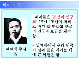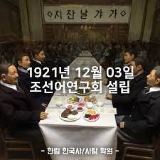 조선어학회 조선어학회는 3.1운동 이후 번지기 시작한 신문화운동의 결과로 만들어진 단체였다. 그러나 그 기원은 1896년 독립신문사 안에 조직된 국문동식회다. 독립신문의 국문판 교보원으로 참가한 주시경이 통일된 맞춤법 격식을 연구할 필요성을 느껴 독립신문사 안에 조직한 것이 바로 국문동식회였다. 주시경 제자인 장지영, 최현배, 이희승 등이 뜻을 모아 다시 조선어연구회를 만들었다. 조선어연구회 회원들은 1926년 11월 훈민정음 반포 480주년을 맞아 한글기념식을 갖고 오늘날 한글날에 해당하는 가갸날을 제정하여 한글의 중요성을 알렸다. 조선어연구회는 1931년 명칭을 조선어학회라 개칭하고 한글사전 편찬사업을 추진했다. 조선어학회는 사전편찬의 기초작업의 하나로 한글맞춤법 통일안을 만들어 1933년 한글반포 487회 기념일에 발표하기도 했다. 한국어 맞춤법 통일과 표준말을 모으는 조선어학회의 활동은 그야말로 민족운동의 새바람이었다