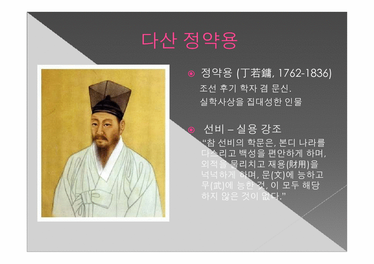 정약용의 명언 실학자들이 활동했던 조선후기는 말기적 병폐를 드러내던 시기로, 대대적인 사회혁신이 필요했다. 무너져 내리는 사회질서를 바로 세우고자 했던 실학자들은 이를 위해 우리나라의 역사와 제도, 말과 풍속, 자연 등을 연구했다. 그러나 현실은 너무 높은 벽이었다. 개혁의지에도 불구하고 미약한 정치기반으로 인해 사회를 변화시키는 데까지는 이르지 못했다. 이 시기 실학정신의 명맥을 잇지 못한 조선왕조는 구한말 열강들의 서세동점 앞에서 힘없이 무너져 내리고 말았다