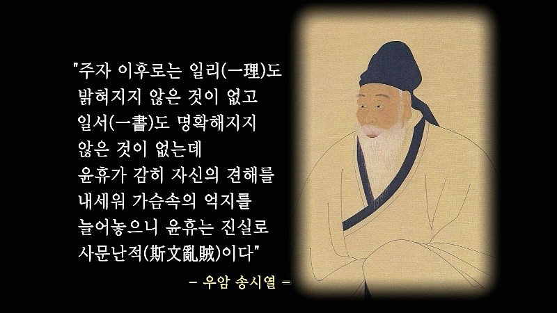 송시열은 주자를 신앙으로 삼을 정도로 주자 제일주의자였다. 송시열은 주자의 남송시대가 자신의 시대와 유사하다고 믿은 인물이었다. 내우외환이라는 주자가 당면했던 문제가 조선의 당면 문제와 유사한 것으로 보았고, 그로 인해 주자가 제시했던 대책은 지금에도 적용된다고 생각했다. 송시열은 유학의 정맥이 윤휴 등에 의하여 심하게 훼손되었다고 생각했고 주자의 학설을 비판한 윤휴를 사문난적으로 몰았다. 윤휴에 대한 송시열의 반감은 훗날 그가 총애하던 제자 윤증가 불화하는 이른바 희니시비라는 노소분당으로까지 비화되었다. 회덕에 살던 송시열과 니산에 살던 윤증은 사제지간이었고, 윤증의 부친인 윤선거는 사계 김장생 문하에서 동문수학한 사이였다. 생전에 율곡의 연보를 편찬하는 과정에서 윤선거가 윤휴의 논지를 인정하는 뜻을 비춘 적이 있었는데 윤선거는 송시열과 윤증 사이를 원만하게 이끌려는 것이었지만 송시열은 윤선거가 윤휴를 두둔해주었다고 생각했다