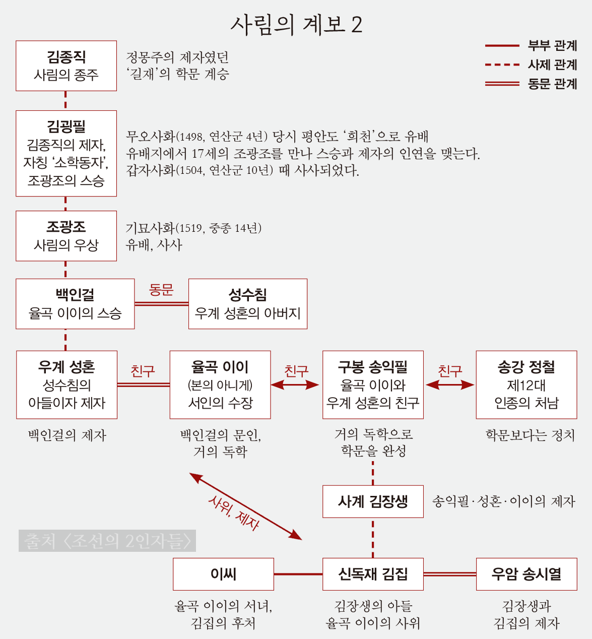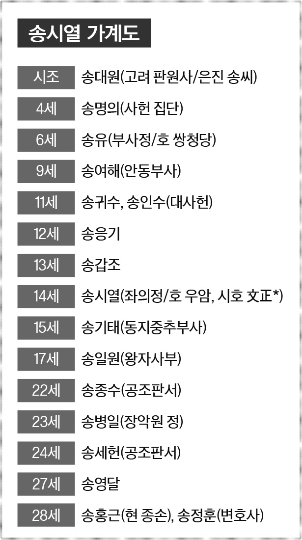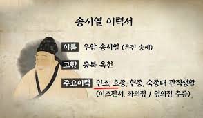 노론(송시열)과 소론(윤증) 분당 조선의 송시열의 나라라고까지 연상하게 만든 우암 송시열은 조선후기 정치계와 사상계를 호령했던 인물이다. 조광조와 더불어 조선을 유교의 나라로 만든 장본인이었던 그는 우리나라 학자 중 자를 붙인 유일한 인물로 역사상 가장 방대한 문집인 일명 송자대전을 남겼다. 물론 그에 대한 역사적 평가는 개개인마다 시대마다 다르겠지만 그가 조선시대에 끼친 영향력에 대해서는 이의가 없을 것이다 조선왕조실록에 3천번이나 그 이름이 등장하는 인물로 사약을 받고 죽었음에도 유교의 대가들만이 오르다는 문묘에 배향되었고 전국 23개 서원에 제향되었다. 그의 죽음은 신념을 위한 순교로 이해되었고 그의 이념을 계승한 제자들에 의해 조선사회는 움직였다
