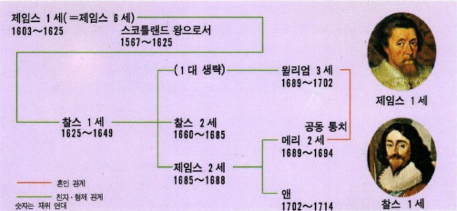그는 외교면에서도 일관성 없는 정책을 폈고, 나중에는 독일의 30년 전쟁에 개입하였다. 이때부터 그의 건강이 악화되기 시작하여 통풍과 신장 결석 떄문에 고통에 당하였다. 1625년에 그가 죽었을 때는 의회의 신용을 완전히 잃었고 국고도 바닥난 상태였다. 이런 상황에서 그의 아들이 왕위에 올라 찰스 1세가 되었다. 찰스 1세(1625-1649)또한 철저한 왕권신수설의 신봉자였다. 그는 왕권은 마그나카르타나 의회에 제약되는 것이 아니라고 주장하며 전체적인 정치를 하였다. 제정이 어려워지면 관습을 무시하고 이미 폐지된 조세를 부활시켰고 일부 귀족과 대상인에게 산업상 및 상업상의 독점권을 주었으며 종교 정책에서도 국왕의 통제 아래 있는 국교를 강제로 믿게 하였다.