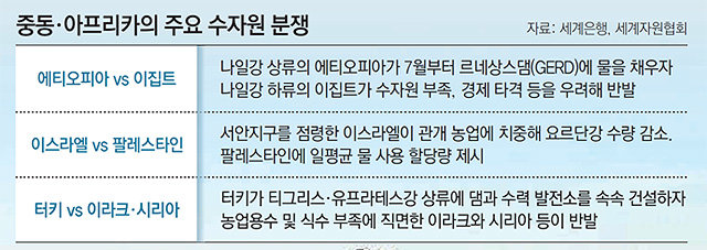 윗논 주인과 아랫논 주인의 물꼬 논쟁이 심지어 마을간의 싸움으로 번지면서 철천지원수로 만들었다. 이것은 더 나아가 국가간의 국제분쟁으로 비하되기도 했다. 국가간 물 분쟁은 주로 물이 부족한 중동과 아프리카 지역이지만 하나의 하천을 여러나라가 공유하는 지역에서는 예외없이 갈등이 존재한다. 특히 요르단강 유역이 물 부족에 정치적 대립까지 더해지고 있다. 이 강을 두고 이스라엘을 비롯한 시리아, 요르단, 레바논 간의 팽팽한 대립은 결국 전쟁으로 이어져 1967년 6월 일명 6일 전쟁이라고 불리는 3차 중동전쟁이 일어났다. 시리아가 요르단강 상류에 댐을 건설하려 한 것이 원인이었다. 댐의 하류에 있는 이스라엘 입장에서는 댐이 건설하면 안정적인 수자원 확보가 어려울 것이라는 판단으로 댐을 폭파한다. 이 전쟁에서 승리한 이스라엘은 갈릴리 호수로 흘러드는 물의 발원지인 골란고원을 강제로 점령한 후 지금까지 시리아에게 돌려주지 않고 있다. 이스라엘의 식수원인 갈릴리 호수의 발원지를 적대국인 시리아에 맡길 수 없다는 이유에서다. 아프리카에서도 나일강에 대해서 이집트를 비롯해 에티오피아, 수단, 케냐 등의 사막국가에 나일강의 존재는 절대적이다. 나일강 상류에 있는 아프리카 최대 호수인 빅토리아 호수가 최근 수위가 급격히 줄어들고 수질이 나빠지면서 나일강을 둘러싼 갈등은 더욱 심해지고 있다. 그뿐 아니라 나일강의 또다른 상류에 있는 에티오피아는 2011년부터 대규모 댐을 건설하고 있다. 이 댐이 준공되면 아프리카에서 가장 크고 세계에서 일곱 번째로 큰 수력발전소가 된다. 하지만 댐이 물을 저장하기 시작하면 하류에 있는 수단, 이집트가 겪어야 할 물 부족은 뻔하다. 이 때문에 이집트는 물 부족이 발생할 경우 군사행동도 불사하겠다고 이미 선포한 상황이다