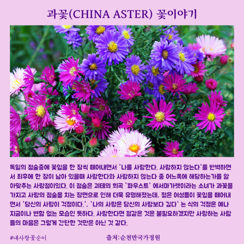 과꽃은 길가나 꽃밭의 양지바른 곳에서 가꾸는 한해살이풀이다. 백두산에서 저절로 자라기도 하는데 본디 꽃 색깔은 진한 보라색이다. 그런데 사람들이 품종을 개량하여 지금은 빨간색이나 분홍색이나 하얀색 꽃이 피기도 한다. 여름철 맨드라미와 함께 꽃밭이나 마당에서 많이 볼 수 있는데 꽃송이가 크고 아름다워서 참 보기 좋다. 과꽃은 줄기가 곧게 자라고 높이 1m까지 자라는 것도 있다. 잎은 어긋나게 붙고 끝이 뾰족한 달걀꼴이다. 잎 가장자리에는 톱니가 있다. 과꽃이 지고 나면 씨앗이 소복이 남는데 하얀 깃털 때문에 이리저리 남아가서 떨어진다. 그래서 과꽃이 있던 자리에는 해마다 과꽃이 자라는 것을 볼 수 있다. 중국에서는 과꽃을 추금화라고 한다. 추금이라는 아름답고 꿋꿋한 여자가 살았는데 변사또처럼 못된 원님과 싸우다가 감옥 안에서 죽었다. 추금이가 죽은 자리에서 꽃 한송이가 피어났는데 추금이가 절개를 기려서 추금화라고 이름을 붙였다. 그게 바로 과꽃이다