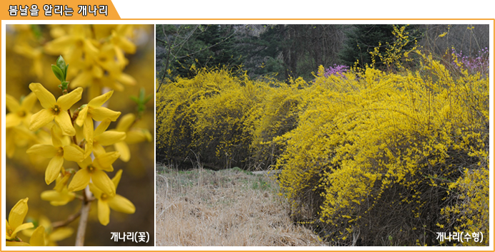 개나리는 산과 들이 모래 섞인 땅에서 잘 자라는 떨기나무이다. 우리나라 토박이 나무인데 심어 기르기도 한다. 키가 3m쯤 되는데 줄기는 가늘고 밑으로 늘어지며 가지를 많이 친다. 어린 가지의 껍질은 연한 초록색이지만 묵은 가지는 잿빛이 도는 밤색이다. 가지는 동그스름한데 각이 지고 땅에 닿으면 뿌리를 내린다. 잎은 마주나고 끝이 뾰족한 타원꼴이다. 3-4월쯤 잎이 나기에 앞서 마디마디 샛노란 꽃이 먼저 피는데 꽃 모양이 꼭 튀밥 같다. 그래서 튀밥꽃이라고도 불린다. 서양에서는 꽃 모양을 보고 황금종이라고 부른다. 개나리는 암수 딴그루 식물이다. 암꽃과 수꽃은 겉모양이 비슷하지만 꽃술의 길이가 조금 다르다. 암꽃은 암술대가 더 길고 수꽃은 수술이 더 길다. 봄꽃 가운데는 잎보다 꽃이 먼저 피는 식물들이 여럿 있다. 진달래나 목련, 산수유도 잎보다 꽃이 먼저 핀다. 개나리는 생울타리로 심거나 꽃을 보려고 꽃밭에 심어 기른다. 씨앗을 뿌려서 기르기는 어렵고 꺾꽂이를 해서 기른다. 3월 하순쯤 묵은 가지를 잘라서 꽂으면 바로 뿌리가 내린다. 물이 잘 빠지고 해가 잘 드는 곳이면 꽃이 더욱 빨리 핀다