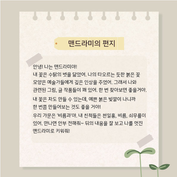 맨드라미는 꽃밭이나 장독대 길가에 심어 기르는 한해살이풀이다. 붉은 줄기는 곧게 자라고 높이는 1m 안팎까지 자라난다. 7-8월에 줄기 끝에 진한 붉은 색 꽃이 피어난다. 노란색이나 흰색 꽃이 피는 것도 있다 꽃은 자잘한 꽃이 한데 모여 꽃이삭을 이루는데 그 모양이 꼭 닭의 벼슬과 비슷하다. 그래서 맨드라미를 닭벼슬꽃이나 계관화라고 부른다. 작은 꽃 하나하나에는 깨알같이 작고 까만 씨앗이 들어있다. 맨드라미는 햇빛이 잘 드는 곳이면 어디서나 잘 자란다. 한번 심어 놓으면 씨앗이 떨어져서 다음 해에 저절로 싹이 튼다. 또 크게 잔손질을 안 해도 잘 자란다. 맨드라미는 장독대나 담장 밑에 두면 참 좋다. 키도 알맞고 해마다 꽃을 볼 수 있다. 맨드라미는 쓸모가 많다. 맨드라미 꽃잎 속에 들어있는 붉은 색소는 아주 좋은 천연 물감이다. 인공 물감과 달리 먹어도 해롭지 않다. 우리 조상들은 떡이나 부침개를 할 때 맨드라미꽃에서 즙을 짜서 붉은 물을 들이곤 했다. 또 꽃을 말려서 달이거나 가루를 내어 설사약으로 쓰기도 했다.