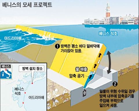 우리가 이민족 침입이라는 아픈 역사로 간척을 시작했던 것처럼 이민족 침입으로 뭍에서 내몰려 갯벌의 삶의 터전을 꾸린 사람들도 있다. 그 도시가 이탈리아 베네치아다. 이들도 훈족을 피해 당시 갯벌과 습지였던 베네치아로 쫓겨간다. 베네치아는 갯벌과 습지로 되어 있었기 때문에 건물을 짓는다는 것은 불가능했다. 물렁물렁한 갯벌에 나무 말뚝을 박아 기초를 다지고 그 위에 건물을 짓는 것이었다. 사람 힘으로 말뚝을 깊게 박을 수 없었기 때문에 그들은 선택한 대안은 많이 박는 것이었다. 베네치아를 대표하는 건물인 산타 마리아 델라 살루테 성당을 짓는 데 110만개 이상의 나무 말뚝이 사용되었다고 한다. 기초를 다지는 데만 2년 2개월이 걸렸다. 지금 1500년이 지난 지금 다시 바다로 내몰릴 위기를 맞고 있다 최근에 기후변화로 해수면 상승이 더해지면서 배네치아 해수면은 도시를 처음 건설했을 때보다 1.8m나 높아졌다고 한다. 지반침하를 가속화했던 지하수 사용도 금지했지만 베네치아는 지금도 매년 1-4mm씩 가라앉고 있다. 침수를 막기 위해 8조원을 들여 가동 둑도 만들었지만 근본적인 대책이 되지 못했다. 이민족 침입을 막아주는 자연의 해자 역할을 하고 먹거리와 삶의 터전을 내어주던 그 바다가 이제는 위협적인 존재로 변했다