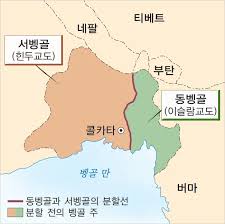 영국은 인도를 지배하면서 주민들 간의 단결을 막기 위해 서로 다른 민족과 종교를 교묘하게 이용하여 대립시키는 정책을 폈다. 그러나 힌두교의 지도자 간디가 이끄는 인도국민회의와 이슬람교의 알리 지나가 이끄는 전인도이슬람연맹이 일치 단결하여 독립운동을 주도했고, 인도는 1947년 영국으로부터 독립할 수 있었다. 하지만 이 과정에서 소수의 이슬람교도들은 힌두교의 지배에서 벗어나 따로 이슬람국가가 세워졌는데 이 나라가 바로 파키스탄이다. 이 과정에서 수십만 명이 사망했으며 영토가 확정되면서 1500만명의 주민들이 힌두교도는 인도로, 이슬람교도는 파키스탄으로 이동해야 했다. 1947년파키스탄은 처음에는 인도를 사이에 두고 동쪽과 서쪽으로 분리된 형태로 독립했는데, 이는 벵골 분할령 때문이었다. 벵골 분할령이란 1903년 영국 지배 당시 행정의 편의를 도모한다는 명분 아래 반영운동이 활발한 벵골만 지역을 분할하여 서벵골의 힌두교는 거주 지역과 동벨골의 이슬람교도 거주 지역으로 분리하여 통치한 것을 말한다. 동서 파키스탄은 지리적으로 1600km나 떨어져 있었을 뿐만 아니라 언어, 문화, 전통에도 큰 차이가 있었지만 인도에 대한 불신으로 한 국가를 이루었을 뿐이었다.