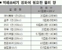 라면 국물을 땅 위에 버리면 부패가 일어나고 이 과정에서 해충과 악취가 발생한다. 그리고 일정 시간이 지나면 모두 분해되어 사라진다. 물이 오염물질을 분해해 정화하는 과정을 자정작용이라고 한다. 여기에는 산소가 필요하다. 미생물이 오염물질을 분해하는 과정에서 산소를 소비하기 때문이다. 오염물질 양이 많으면 필요한 산소량도 당연히 많아진다. 물속에 녹아 있는 산소량은 한정되어 있기 때문에 기준량 이샹의 오염 물질은 분해되지 못하고 썩기 시작한다 이렇게 되면 물 색깔이 검게 변하고 악취가 발생하며 더 이상 생물이 살 수 없는 환경이 된다. 한편 물속의 오염 물질량을 측정하는 방법으로 주로 사용되는 수질 항목이 바로 생화학적산소요구량 또는 BOD(biochemical oxygen demand)이다. 의미는 오염 물질이 분해하는 과정에서 요구되는 산소량이다. 단위는 물 1리터 당 소비하는 산소량을 뜻하는 mg/L 또는 피피엠으로 표시한다. 이 수치가 낮을수록 깨끗한 물이다. 우리나라의 경우 BOD 2mg/L이하를 좋은 물이라고 정하고 있다. 그리고 10mg/L초과하면 매우 오염된 물이다. 한편 우리가 일상에서 자주 먹는 음식의 BOD는 상상 외로 높다. 라면국물, 된장국, 육개장 등의 국물을 가진 음식의 BOD는 20만mg/L를 훌쩍 넘는다. 우유, 콜라 등의 음료를 비롯해 소주, 막걸리 등의 술도 10만mg/L의 높은 값을 나타낸다. 가정하수와 비교해 보면 가정하수의 BOD는 200mg/L로 라면 국물의 BOD가 20만mg/L로 1천배 오염도가 높다. 따라서 라면 국물을 깨끗한 하천 수준인 BOD 2mg/L로 만들기 위해서는 버린 라면 국물양의 10만배의 해당하는 맑은 물이 필요하다
