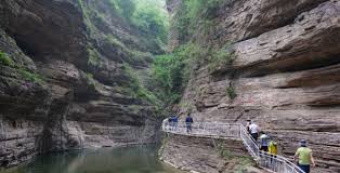 태항산은 시루떡처럼 층층이 얹고 또 얹어진 대형 절벽들의 향연에 시선을 빼앗긴다. 태항산은 조조로 놀라게 만든 산이다. 조조는 관도대전에서 승리한 후 원소군 잔당을 격파하기 위해 군대를 이끌고 겨울에 태항산을 넘은 적이 있다. 그런데 혹한의 추위, 험하기 짝이 없는 산세에 경악을 금치 못했다. 이에 시를 지었다. 제목은 고한행이다. 북으로 태항산에 오르니, 험하도다 ! 어찌 이리도 드높은가 ! 비탈길에 수레바퀴가 부서진다로 시작되는 옛 시다. 먼저 태항산은 산이 아니다. 산맥이다. 지질학으로는 400km 지도상으로는 약 600km 남북으로 길게 뻗은 형태다. 동서로는 200-250km정도 된다. 거대한 협곡의 위세로 곧잘 비교도는 게 장가계이다. 지질적으로 유사한 장가계는 기둥과 탑형의 지형이 많은 반면, 태항산은 험하고 큰 절벽이 많다. 현지 가이드는 장가계는 까칠하고 섹시한 여자라면 태항산은 건강하고 늠름한 남자라고 갈무리한다. 태항산을 태행산으로 부르기도 한다. 거대하고 줄지어 늘어진 산이란 의미다. 그런데 도대체 이렇게 생겼냐는 것이다. 협곡 안에 협곡이 그리고 그 안에 또 협곡이 있는 굉장히 모양새다. 지질학적으로 태항산은 보통 4개 층이 평균 높이 800m에 걸쳐서 겹쳐 있는 형태라고 한다. 맨 위인 4층부터 보면 이 층은 73만 –240만 년 전 사이에 홍수로 인한 퇴적이 만들었고, 그 아래 3층은 6억년 전에 바다 밑에서 형성됐으며 2층은 18억년 전에 마찬가지로 바다에서, 맨 아래인 1층은 25억년 전에 화산 분출로 각각 형성됐다고 한다. 맨 꼭대기 능선은 주로 해발 1500-2000m다. 태항산의 가장 전형적인 모습을 볼 수 있는 곳이 바로 태항대협곡이다. 태항산 남동쪽에 남북으로 길게 붙은 임주시에서 가깝다. 시내에서 태항산쪽을 올려다보면 절벽이 병풍처럼 늘어서 있는데 바로 그 너머에 대협곡이 감춰져 있다. 비룡협 골짜기에 들어서면 도화담이 있다. 물안개와 무지개를 볼 수 있을 정도로 멋지다. 좁다란 잔도를 따라 절벽을 짚고 오를 수 있다. 골짜기 안으로 들어서면 으슬으슬 춥다 그만큼 골이 깊고 물살은 거세며 바람은 차다. 구련폭포는 태항대협곡에서 가장 넓은 폭포며 수량이 적으면 얌전하고 조신하게 많으면 마치 회오리처럼 물보라를 일으켜 늘 멋있는 모습이라는 설명이다