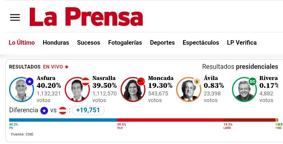 시오마라 카스트로 온두라스 대통령이 지난달 30일 실시된 온두라스 대선에 트럼프 대통령이 간섭했다는 이유로 선거 무효를 주장했다. 카스트로 대통령은 트럼프 대통령이 용감하고 애국적인 리브레당 후보 릭시 몬카다에게 투표하면 결과가 따를 것이라고 온두라스 국민을 위협했다며 이러한 행동이 간섭이라고 지적했다. 또 이번 투표가 협박, 강압, TREP 조작, 그리고 국민의 의지 왜곡으로 얼룩졌다고 주장했다. 그러면서 이러한 선거 쿠테타 행위를 유엔, 유럽연합 등 국제기구에 고발하겠다고 말했다. 이어 주권은 협상의 대상이 아니며, 민주주의는 포기할 수 없다고 호소했다. 지난달 30일 실시된 온두라스 대선의 개표는 기술적 문제로 여러 번 지연을 겪다 8일 재개됐다. 현재 개표율 99.4% 기준 트럼프의 지지를 받는 우파 성향 나스리 아스푸라 국민당 후보가 40.52%의 득표율을 기록해 중도 성향 살바도르 나스랄라 자유당 후보(39.5%)를 박빙의 차이로 앞서고 있다. 카스트로 대통령의 소속당인 좌파 성향 리브레당 몬카다 후보는 약 19.3%의 득표율로 두 후보에 크게 뒤쳐졌다. 그러나 개표 장기화에 나스랄라와 몬카다 후보가 부정선거를 의심하며 선거 결과 불복 의사를 드러내기 시작했다. 리브레당은 지난 7일 선거의 완전한 취소를 요구하며 시위와 파업을 주장하는 한편, 공무원들에게 정부 이양에 협조하지 말 것을 촉구했다. 이번 선거는 트럼프 대통령이 개입하면서 더욱 복잡한 양상을 띠게 됐다. 트럼프 대통령은 선거 직전인 지난달 28일 민주주의가 오는 11월 30일 온두라스 선거에서 시험대에 올랐다며 아스푸라를 공개 지지했다. 트럼프 대통령은 리브레당이 재선되면 마약 테러리스트가 온두리스를 점령할 것이라며 아스푸라가 승리하지 못하면 원조를 중단하겠다고 위협했다. 한편 온두라스 중앙선거관리위원회는 약 14.5%의 집계표에서 불일치가 발견돼 재검토가 필요하다고 밝혔다. 법정 시한인 오는 30일까지 당선자를 공식 발표해야 한다. 신임 대통령 취임식은 1월 27일로 예정됐다