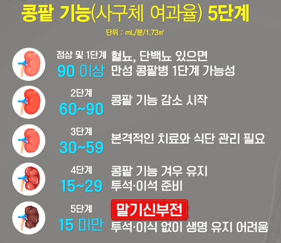 콩팥(신장)은 모양이 강낭콩과 비슷해서 붙여진 이름이다. 기능이 떨어져도 증상이 잘 나타나지 않아 조기 발견이 어렵다. 몸속의 수분과 혈압을 조절하고 혈액 속의 노폐물을 걸러내는 역할을 한다. 혈액을 깨끗하게 만드는 여과 기능을 담당한다. 콩팥에 이상이 생기면 노폐물을 걸러내지 못해 몸에 독소가 쌓이고, 심하면 사망할 수 있다. 만성 콩팥병(만성 신부전)은 콩팥 기능이 감소하거나 단백뇨와 같은 콩팥 기능이 3개월 이상 지속되는 상태다. 초기에는 거의 증상이 없고 콩팥이 상당히 나빠진 이후에 발견되는 경우가 많다. 만성 콩팥병은 한번 발생하면 콩팥 기능이 완전히 회복되지 않는다. 투석 등 삶의 질을 망가뜨릴 수 있어 예방이 무엇보다 중요하다. 수축기 혈압이 140mmHg이상인 환자는 120mmHg 미만인 환자에 비해 신장 기능 악화 위험이 약 1.82배 높았다. 신장 기능 감소 속도도 약 2배 빨랐다. 국내 말기 신부전 환자는 2023년 기준 18만명으로 10년간 약 2배 증가했다. 콩팥에 이상이 있으면 몸이 붓는 부종과 고혈압이 나타난다. 콩팥이 몸속 염분을 적절히 배출하지 못해 염분 및 수분이 쌓인 탓이다. 심장 이상(심부전)으로 이어져 숨이 차는 증상이 생긴다. 한편 만성콩팥병 예방을 위해 당뇨병과 고혈압부터 예방 관리해야 한다. 당뇨병은 혈액을 끈적끈적하게 만들어 각종 노폐물을 모세혈관에 쌓이게 한다. 또한 혈압이 높으면 콩팥을 이루는 사구체에 지속적으로 압력이 가해져 혈관벽에 단백질과 지방 등이 쌓이게 되고, 사구체가 손상되어 콩팥이 제 기능을 못하게 된다. 고지방 고탄수화물 음식을 절제하고 염분을 줄여서 혈당 혈압 관리를 잘 해야 한다