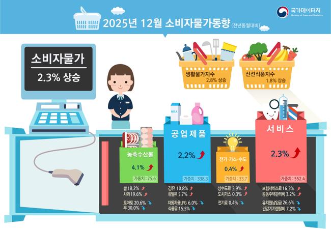 지난해 12월 석유류 가격이 10개월만에 최대 폭으로 상승했다. 최근 국제유가가 하락세를 보이고 있지만 환율이 달러당 1500원 선을 위협할 정도로 뛰어 오르며 휘발유, 경유 등의 유통가격을 밀어올렸기 때문인 것으로 풀이된다. 환율의 직접적인 영향을 받는 수입 쇠고기 등 수입 먹거리는 가격도 크게 뛰었다. 지난해 12월 소비자물가는 전년 동월 대비 2.3%상승했다. 9월 이후 넉달 연속 2%대 오름세다. 특히 12월에는 고환율의 여파로 석유류가 6.1%급등하며 물가상승을 주도했다. 경유(10.8%), 휘발유(5.7%)가격 모두 가파르게 올랐다. 수입 쇠고기(8.0%), 쌀(18.2%) 사과(19.2%)등 먹거리 물가도 급등세를 이어갔다. 농축산물 물가는 4.1%올랐다. 전문가들은 새해에도 2025년 수준의 환율 변동성 장세가 이어질 경우 수입물가 상승분이 가공식품과 외식물가로 전이되는 2차 파급효과가 본격화될 수 있다고 경고하고 있다. 2026년 우리나라 소비자물가 상승률 전망치는 2.0%로 지난달 말 1.9%과 비교해 0.1%포인트 상승했다.