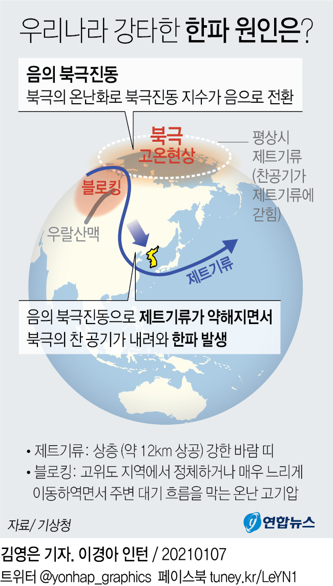 이번 주 화요일부터 영하 10도 이하의 강한 한파가 한반도를 덮치겠다. 이번 겨울 들어 가장 강하고 강하고 긴 한파가 될 것으로 예상된다. 평년보다 온화했던 지난주 대구와 창원은 낮 기온이 20도에 육박한 날도 있었다. 이번주부터 상황이 급변한다. 시베리아에서 밀려온 찬 공기가 한반도를 덮치며 영하 10도 밑으로 기온이 곤두박질하겠다. 20일 서울 최저기온이 영하 13도이다. 이번 북극 한파는 일요일인 25일까지 최소 6일 동안 이어질 것으로 보인다. 원인은 북극 아래쪽 베링 해협부터 한반도까지 이어지는 고기압 벨트의 블로킹 현상 때문이다. 대기 상층에선 북서쪽의 한기가 끊임없이 내려오고 대기 아래쪽에선 저기압이 계속 돌면서 이 차가운 공기를 우리나라 쪽으로 끌어내리는 것이다. 기상청 통보관에 의하면 현재 우리나라를 기준으로 동쪽에는 기압계가 정체되는 저지 고기압 벨트가 발달하고 있다. 앞으로 서쪽에서 접근하는 찬 공기가 한반도에 밀려 내려오면 이번 한주 강한 한파가 지속할 것으로 예상된다. 이번 주 내내 최저기온이 영하 10도를 밑돌겠는데 이처럼 오랫동안 한파가 머무는 건 이번 겨울 들어 처음이다. 바람까지 많이 불어 체감온도는 영하 20도까지 떨어질 수 있다. 추위는 블로킹 현상이 해소되는 26일 이후에도 쉬이 물러가지 않을 것으로 기상청은 전망했다. 이번 주 중반에는 전라도 서해안을 중심으로 폭설도 예상하고 있다