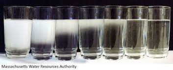 수돗물이 뿌옇게 나오는 현상은 주로 겨울철 온수를 틀었을 때 나타난다. 수도꼭지를 냉수 쪽으로 돌리면 뿌연 색은 사라진다. 물의 온도가 올라가면 공기가 작은 공기 방울로 바꾸기 때문이다. 따라서 물의 온도에 따라 물 속에 녹을 수 있는 공기량은 달라진다. 온도가 낮은 물에 녹아 있던 많은 양의 공기는 물의 온도가 올라가면 작은 공기 방울로 바뀐다. 물 속에 녹아 있을 수 있는 공기량의 줄어들었기 때문이다. 한편 물 속에 기체가 녹을 수 있다는 사실은 물고기와 같은 수중 생물이 살아기는 데 절대적인 역할을 한다. 육상에 있는 동물은 폐로 호흡하고 물 속에 사는 동물은 아가미로 호흡하는데 물 속에 녹아 있는 용존산소를 들이마신다. 물 속에 용존산소가 부족해지면 물고기는 수면 근처로 올라와 입을 뻐끔거린다. 그러나 물고기는 입으로 숨을 쉬는 것이 아니라 아가미로 숨 쉬기 떄문에 수면 근처는 대기에서 녹아 있는 산소가 많기 때문에 물고기가 수면 근처로 몰린다. 용존산소 농도는 수질의 좋고 나쁨을 판단하는 기준이 된다. 물에 녹을 수 있는 산소량은 물의 온도에 따라 달라지지만 20도를 기준으로 할 때 최대 9mg / L이다. 보통 용존산소가 5mg / L이상이면 좋은 물이다. 물속에 산소를 공급하기 위해서는 물과 공기가 자주 접촉하는 방법으로 하면 된다. 어항과 수족관에서 볼 수 있는 기포발생기가 산소 공급과 관련이 있다. 물 속에 공기를 대기로 보내는 것은 물레방아 모양의 수차를 설치해 물을 튀겨 작은 물방울이 공기와 접촉하도록 한다. 지구 대기의 21%는 산소로 구성되어 있다. 대기 중의 산소는 일정하게 물 속에 녹아들면서 물 속에 사는 생물에게 필요한 산소를 공급한다.