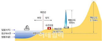 남한에서 백두산의 높이는 2744m이고 북한은 2750m라고 한다. 같은 백두산인데 높이가 다른 이유는 해발고도의 차이 때문이다. 산 높이를 나타낼 때 쓰는 해발은 해수면으로부터 얼마나 높은가를 의미한다. 그런데 해수면의 높이는 밀물과 썰물, 파도로 계속 변하기 때문에 기준을 정하는 것이 쉽지 않다. 해수면을 고정해 일정한 높이로 정하는 방법은 해수면의 평균치를 사용한다. 우리나라의 평균 해수면 기준은 일제강점기에 만들어졌다. 1913-1916년에 걸쳐 청진, 원산, 진남포, 인천, 목포의 다섯 개 바다에서 해수면 높이를 측정해 그 평균값을 기준 높이로 정했다. 이에 비해 북한은 동해안의 원산 앞바다를 기준으로 한다. 기준이 되는 바다의 위치와 높이가 다르기 때문에 같은 백두산이지만 해발고도가 달라질 수 밖에 없다. 평균 해수면 높이를 정하고 나면 그 높이를 알 수 있도록 어디엔가 표시를 해두어야 한다. 바다는 계속 움직이기 때문에 높이를 알려주는 표시하는 대신 고정된 육지에 높이를 표시한다. 이곳을 해발고도의 근원이 되는 기준점이라는 의미로 수준원점이라고 하며 우리나라의 경우 인천광역시 인하대학교 부지 내에 설치되어 있다. 인천광역시에 설치된 우리나라 수준원점의 해발고도는 26.6871m이다. 수준원점이 평균 해수면보다 이만큼 높은 위치에 설치되어 있다는 의미이다. 이 수준원점은 대한민국의 국토에 있는 산과 건축물의 높이를 재는 기준점이 된다. 최근 들어 해발고도의 기준이 되는 해수면이 점점 높아지고 있다고 한다. 우리 정부는 연안의 해수면 상승 높이는 매년 3mm 정도이다