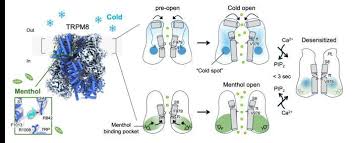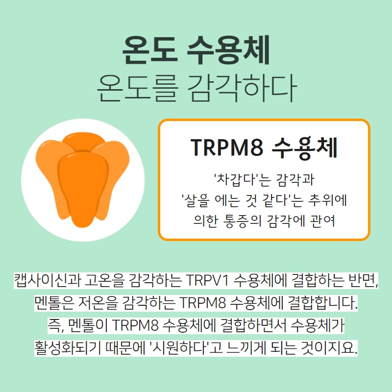 추운 겨울 밖으로 나갈 때 차가움과 박하사탕, 민트초콜릿을 입에 넣거나 멘톨 성분이 들어간 샴푸로 머리를 감았을 때 느껴지는 시원함은 우리 몸속 미세분자 센서가 작동해 뇌에 차가운 감각을 전달하면서 생기는 것이다. 미국 듀크대 의대 생화학과 연구팀은 민트에서 추출한 화합물인 멘톨이 어떻게 시원함을 느끼게 하는지 정확한 원리를 규명했다. 연구팀은 TRPM8이라는 단백질 채널에 주목했다. TRPM8은 피부, 입, 눈에 분포하는 감각 신경세포 막에 있다. 이 채널은 대략 8-28도의 차가운 온도에 반응해 열리며 이온이 세포 안으로 흐르게 함으로써 뇌로 가는 신경 신호를 유도한다. 멘톨, 유칼립투스를 비롯한 특정 화합물이 특유의 시원함을 주는 이유도 이 때문이다. 연구팀은 전자빔으로 급속 냉동된 단백질을 촬영하는 초저온 전자 현미경을 사용해 TRPM 8이 닫힌 상태에서 열린 상태로 전환되는 과정의 여러 구조적 스냅샷을 포착했다. 추위와 멘톨 성분이 공유되면서도 서로 구별되는 원격 조절 체계를 통해 채널을 활성화한다는 사실을 발견했다. 추위는 주로 이온이 통과하기 위해 실제로 열리는 통로 영역의 변화를 유도하는 반면, 멘톨은 단백질의 다른 부분에 결합해 통로까지 전달되는 형태 변화를 유도한다. 추위와 멘톨이 결합하면 그 반응이 상승해 강화되는 것이 확인됐다. 연구팀은 단백질 내에서 온도 감지에 독특하게 중요한 역할을 하고, 장시간 추위에 노출됐을 때 채널 반응성이 떨어지는 탈감작되는 것을 방지하는 이른바 콜드 스팟 영역을 식별했다. TRPM8이 제대로 작동하지 않으면 만성 통증, 안구건조증, 특정 암을 포함한 질환을 유발하는 것으로 알려졌다. 이번 연구는 추위와 화학적 자극이 어떻게 통합해 시원한 감각을 만들어내는지에 대한 첫 분자적 정의를 제시하고 오랫동안 과학자들이 고민케 했던 감각 생물학의 근본적 의문에 답을 제시했다는 점에 의미가 크다고 했다. 결론적으로 TRPM 8은 추울 때 뇌에 신호를 보내는 주요 센서이다. 멘톨은 채널의 특정 부분에 결합해 실제 낮은 온도에서처럼 채널이 열리도록 하는 일종의 속임수를 쓴다며 추위가 특정 구조적 변화를 어떻게 일으키는지 파악할 수 있게 됨에 ᄄᆞ라 이 경로를 표적으로 하는 새로운 치료법을 개발할 수 있는 토대가 될 것이라고 덧붙였다