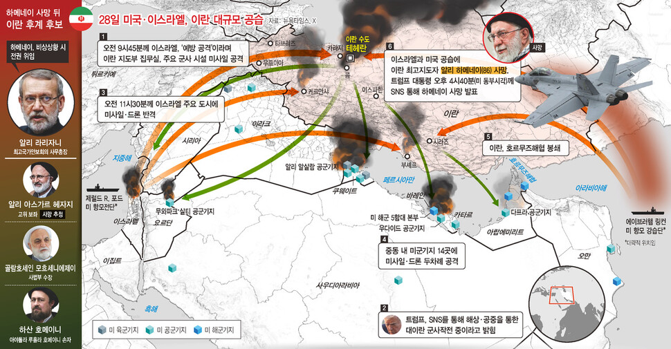 트럼프 대통령이 거듭 불가 메시지를 냈던 사망한 알리 하메네이 차남의 모즈타바 하메네이의 이란 최고지도자 승계가 8일 발표되면서 일주일 넘게 계속된 미국과 이스라엘의 대이란 공세 수위가 높아질 것으로 전망된다. 알리 하메네이보다 온건한 성향의 인사가 이란에서 친미 정부를 이끄는 베네수엘라 모델을 구상했으나 모즈타바는 이란 군부에서 신망이 두터우며 대미 강경파로 평가된다. 이란 후계 구도에 자신이 관여해야 한다고 주장한 트럼프 대통령은 하메네이의 아들은 받아들일 수 없다고 강한 어조로 거부감을 드러낸 바 있다. 이번 전쟁에서 미국에 쉽사리 굴복하지 않겠다는 의지를 보인 것으로도 해석되는 측면이 있다 세계 에너지 수송의 길목인 호르무즈 해협에 대한 사실상의 봉쇄와 미군기지 공격을 명분삼은 주변국 겨냥 공세 등으로 유가를 포함한 국제 경제에 혼란을 초래함으로써 미국이 장기전을 하기 어려운 상황으로 몰고 가겠다는 것이 이란의 구상일 수 있어 보인다. 트럼프 대통령은 자신이 추구하는 바를 이룰 때까지 시간적 제한을 두지 않고 무력 사용의 여러 가지 옵션을 테이블에 올려둔 채로 이란에 대한 군사작전을 이어가겠다고 공언했다. 전쟁의 부담 요인인 유가 우려는 이번 작전이 끝나면 유가는 내려간다며 일축했고 국내 반대 여론도 아랑곳하지 않겠다는 태세다. 또 그의 참모들은 이란을 공격할 화력 보급이 충분하다고 밝혀왔다. 그리고 참수 작전이 모즈타바를 겨냥해서도 재개될지에 이목이 쏠린다. 트럼프 대통령은 지난 3일 이란에서 지도자가 되고 싶어 하는 것처럼 보이는 모든 사람은 결국 죽음을 맞는다고 발언하기도 했다. 이란이 차기 최고지도자를 중심으로 전열을 정비해 장기전으로 버틸 경우 트럼프 대통령이 직면할 국내외 정치 경제적인 압박도 점증할 수 밖에 없다. 이번 전쟁 관련 미군 사망자가 이날부로 7명으로 늘어난 것도 부담으로 작용하고 있다. 따라서 트럼프 대통령이 강경 메시지를 낼지, 모즈타바의 행보를 지켜보겠다는 신중 기류를 보일지가 이번 전쟁의 향배에 큰 영향을 줄 것으로 예상된다