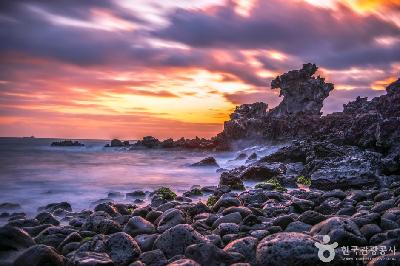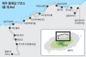 제주올레길 가운데 17코스는 제주시 도심으로 들어가는 관문 같은 길이다. 광령 1리에서 김만덕기념관까지 총길이 19.5km로 약 6-7시간이 소요된다. 제주 도심과 마을, 해안을 고르게 지나며 제주시의 생활공간을 가장 직접적으로 보여준다. 산지천은 한라산에서 시작된 물줄기는 제주시 도심을 관통해 동문시장 옆을 지나 제주항으로 흘러간다. 제주시의 생활과 역사를 함께 품고 흐르는 하천이다. 제주항 서부두에서 탐라문화광장까지 이어지는 길에는 김만덕기념관과 김만덕객주, 깨어진 공덕비 등이 눈길을 끈다. 산지천을 가로지르는 작지만 아름다운 아치형 다리들도 인상적이다. 제주시에서 가장 오래된 재래시장 가운데 하나로 제주 특산물과 해산물를 파는 상점들이 빼곡하다. 제주목 관아는 조선시대 제주를 통치하던 행정 중심지였다. 목사가 머물며 정무를 보던 곳으로 관덕정을 중심으로 여러 관청 건물이 자리하고 있었다. 외대문과 중대문을 지나면 망경루를 중심으로 관아 건물들이 대칭구조를 이룬다. 절제사가 근무하던 흥화각, 목사가 정무를 보던 연희각, 여가 공간인 귤림당, 군관들이 머물던 영주협당 등이 배치돼 조선시대 행정 공간의 구조를 보여준다. 이곳에서 제주목사는 행정을 집행하고 백성들의 송사를 처리하며 섬 전체의 일을 관장했다. 특히 회랑은 제주목 역사체험 공간으로 꾸며져 있으며 세걔의 전시실로 구성돼 있다. 제 1전시실에서는 제주목의 역사와 출토 유물을, 제 2전시실에서는 부임 목사의 생활상과 행렬도를 소개한다. 제 3전시실에서는 제주읍성 주요 건물의 변천과 제주목의 생활상을 살펴볼 수 있다. 용연계곡은 한라산에서 내려온 물이 바다와 만나는 지점에 형성된 계곡이다. 깎아지른 듯한 현무암 절벽 사이로 맑은 물이 흐르고 계곡 위에는 용연구름다리가 놓여 있다. 계곡을 지나 바닷가로 이어지는 길 끝에는 용두암이 자리한다. 파도와 바람에 깎인 현무암이 용의 머리를 닮았다고 해서 붙여진 이름이다. 바다를 향해 고개를 들고 있는 듯한 바위의 모습은 보는 각도에 따라 또 다른 형상을 보여준다.
