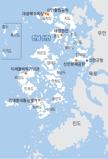 이흑암리에 조희룡 적거지가 복원돼 있다. 1만마리 갈매기가 우는 집이라고 만구음관 편액이 걸려있다. 홍매화가 벽그림으로 그려진 마을 앞에 조희룡 적거지 표지석과 조선문인화의 영수 조희룡 기념비도 세워져 있다. 활짝 핀 홍매화처럼 마을 지붕도 온통 빨갛게 채색돼 있다. 대광해수욕장 앞에 조희룡미술관도 있다. 조희룡의 용매화의 영감을 얻은 용난굴은 마을 앞 어머리 해변에 있다. 바위 속에 살던 이무기가 용이돼 하늘로 올라갔다는 굴이다. 굴이 길이 150m, 높이 8m에 이른다. 바닷물이 빠지는 썰물 때 문을 열고 사람을 맞는다. 바닷물이 들면 물에 잠겨 반대폭 바다와 물길로 통한다. 조희룡이 즐겨 본 달의 배경 무대인 은동도가 있다. 그 너머는 보물선이 가라앉은 도덕도 앞바다이다. 이흑암리는 임자도 남쪽에 있다. 마을을 둘러싼 대둔산과 삼각산 산그늘이 커 해가 일찍 넘어가고 어둠이 빨리 시작된다. 그때가 되면 검은 바위 두 개가 우뚝 솟은 것처럼 보인다. 이흑암으로 이름 붙은 이유다. 대둔산 아래 여섯 군데에 마을이 터를 잡고 있다고 육암, 육바구로도 불린다. 대둔산 산정에 옛 대둔산성의 흔적도 남아있다. 조희룡이 유배생활을 할 땐 마을 앞까지 바닷물이 들어왔다. 일제강점기 때 간척이 이뤄져 농토가 됐다. 간척으로 논밭이 된 땅엔 대파가 많이 심어졌고 임자도는 대파 주산지다. 마을 앞 양배추밭도 넓다